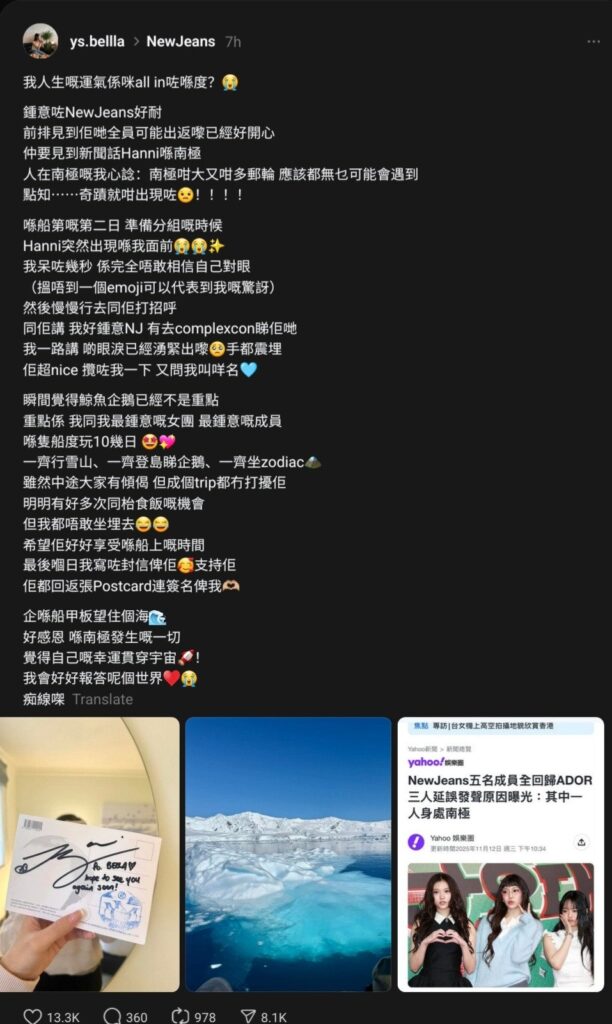 La fanatica escribir: “¿Acaso gaste la suerte de toda mi vida en esta ocasión? He sido fan de NewJeans por largo tiempo. Estaba muy feliz cuando hace poco surgió la probabilidad de que ellas vuelvan. Luego vi los titulares sobre qué Hanni estaba en la Antártida”. Y agregó: “Pero la Antártida es tan grande y hay tantos cruceros. No hay posibilidades de que justo yo la encuentre. ¡¡¡Pero ocurrió un milagro!!! ”